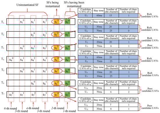 - The upstream SFs with only one “rich candidate UAV” are first instantiated. As shown in Figure 4, contained in has only one “rich candidate UAV”, so it is instantiated first. When facing multiple such upstream SFs (e.g., ), randomly select one of them for instantiation;