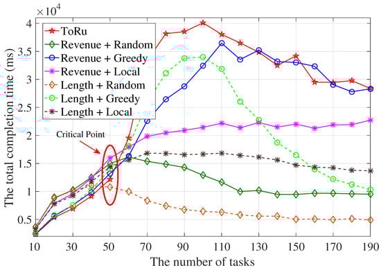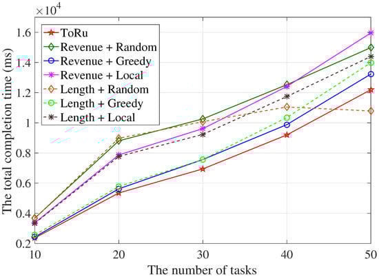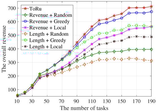 Figure 8 presents the overall revenue under different tasks. As can be seen in Figure 7, when the number of tasks is small, the task execution success ratios of the algorithms except “Length + Local” and “Revenue + Local” are all 100%. Therefore, they have equal revenue. With the increase of tasks, the overall revenue of each algorithm increases rapidly before the critical point, then, the growth becomes slow. Moreover, the overall revenue of algorithm ToRu is always the largest among the seven algorithms because it not only ensures that tasks with higher payments are executed, but also ensures a higher task execution success rate. The algorithm “Revenue + Greedy” performs better, which is mainly because it first completes tasks that pay more. In addition, we can see that the performance of algorithms based on revenue sorting principle is better than that of algorithms based on length sorting, which is reasonable.