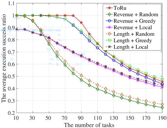 Figure 7 shows the average execution success ratio of algorithms under different tasks. The result shows that algorithm ToRu has the highest success ratio, especially with the gradual increase of tasks, it can still maintain a high success ratio. This is mainly because ToRu only selects candidate UAVs with low performance to meet the requirements when instantiating SF, in other words, the improvement in the task execution success ratio comes at the expense of individual task execution performance. The algorithms “Length + Local” and “Revenue + Local” show the worst performance before the critical point, because they do not fully utilize the resources of the UAV network. With the increase of the number of tasks, “Length + Greedy” has the highest task execution success ratio. This is reasonable since it serves tasks with the shortest SFCs first, which consume less computation and communication resources. Finally, the algorithms “Length + Random” and “Revenue + Random” shows the poor performance when the network load is heavy.