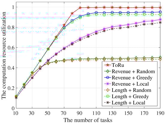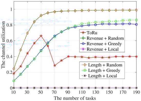 Figure 9 and Figure 10 show the utilization of channel and computation resources of different algorithms, respectively. We can find that the channel resources consumed by the algorithm ToRu increase with the number of tasks before the critical point. This is because the resources are sufficient before the critical point, and the algorithm ToRu seeks to minimize the completion time sum of tasks without caring about resource consumption. Due to the limited communication resources between UAVs, it often becomes the bottleneck of the task execution success ratio. When the number of tasks requesting service is small, Algorithm 2 is executed. It instantiates each requested SFC in parallel mode, that is, it selects the most preferred UAV for each SF contained in different SFCs at the same time, which will lead to the premature consumption of the most preferred UAVs early. Therefore, the probability that all SFs contained in one SFC are deployed on the same UAV will be reduced. Different SFs contained in one SFC have to interact with each other, resulting in the high channel utilization. On the contrary, when the number of tasks requesting service is large, Algorithm 3 is executed. It instantiates each requested SFC in serial mode, that is, it starts to instantiate the next SFC after having instantiated all SFs contained in the previous SFC, so that the probability that all SFs contained in one SFC are instantiated on the same UAV will be greatly increased. The interaction between different SFs on the same UAV will no longer consume channel resources, thus, the channel utilization will be rapidly reduced. As shown in Figure 9, after the critical point, the channel utilization in the algorithm ToRu decreases greatly and remains stable at a low value. This inevitably leads to the increase of the completion time sum of tasks (as shown in Figure 5), but it can improve the task execution success ratio (as shown in Figure 7). The algorithms “Revenue + Local” and “Length + Local” do not consume channels because they only execute tasks on the local UAV. The channel utilization of other algorithms increases sharply with the increase of the number of tasks, so that their computation resources cannot be fully utilized, as shown in Figure 10. This will reduce the task execution success ratio and the overall revenue, as shown in Figure 7 and Figure 8. It is obvious that the computation utilization of the algorithm ToRu has reached 100%, which is the reason why its task execution success ratio and overall revenue are the highest.