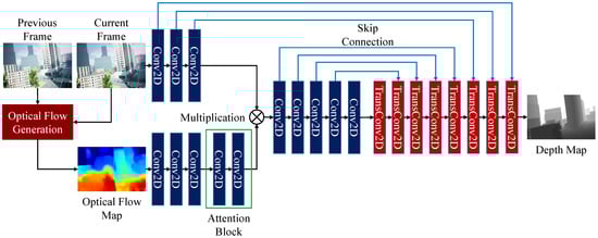 As shown in Figure 1, this network has thirteen convolutional layers and eight transposed convolutional layers. The kernel size is four, and the stride is two in these layers. In addition, between these layers, there is ReLU as an activation function and batch normalization. In the attention block, the features of the optical flow map extracted by the two convolutional layers are normalized from 0.0 to 1.0 by the Sigmoid function, and the output channel size is the same as the monocular image features before multiplication to determine the attention area in each channel. Finally, the output of the attention block is multiplied by the feature values of the monocular image. In past work, some pixels in the optical flow map are selected at certain intervals and added to the RGB map [34]. This approach does not guarantee that the optical flow pixels containing key information are selected, and at the same time, it is possible to select noise points and add them to the RGB image. In this work, we select the pixels to be added through the attention block. The attention block can determine which areas and channels are not needed from the information in the optical flow map when the output of the attention block is close to 0, and which areas and channels should be focused on in the next layer when the output of the attention block is close to 1. Since noisy optical flow features are used for the attention block, the attention block can reduce the impact on the output of depth estimation and maximize the use of the optical flow map.