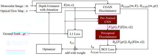 As shown in Figure 1, the proposed method has two main processes. Firstly, the proposed method generates optical flow from serial frames. Secondly, the proposed method estimates depth using CNN with attention, which takes a monocular image and an optical flow map. In addition, a discriminator different from the conventional CGAN is added during the training of the estimator to improve accuracy. In Section 2.1, we introduce optical attention and depth estimation in detail. In Section 2.2, we detailed present the perceptual discriminator used in training.