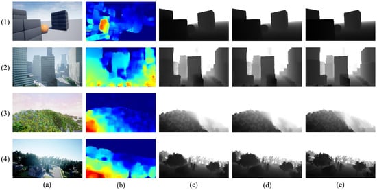 Inputs and outputs each method: (a) monocular image, (b) optical flow map, (c) Shimada et al. [34], (d) ours, (e) ground truth, (1) Blocks, (2) City Environment, (3) Coastline, (4) Neighborhood.
