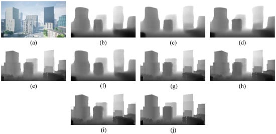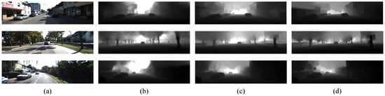 As shown in Figure 6b–d,f, the outputs of the combinations without the skip connection have fuzzy edges and the overall image appears blurred. This fuzzy edge causes significantly decreased accuracy. Therefore, skip connections can recover location information that becomes ambiguous when the network extracts local features. As shown in Figure 6d,f,h,i, the outputs of the combinations with the optical flow attention have a more accurate depth than without it. Therefore, the results show that optical flow information is correlated with depth, and optical flow attention is an effective use of this information. As shown in Figure 6c,f,g,i, the outputs of the combinations including the perceptual discriminator have been able to estimate the depth of thin objects such as trees, which are lost in the other combinations. These results demonstrate the perceptual discriminator can distinguish vanishing objects from the input features and propagate them back to the estimator as losses. Therefore, all of the proposed factors are essential for a lightweight and accurate depth estimation network.