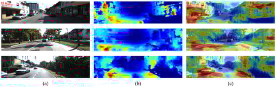 Visualization how the optical flow attention works in KITTI dataset: (a) monocular images, (b) optical flow maps, (c) visualization of attention.