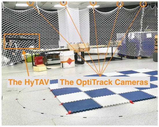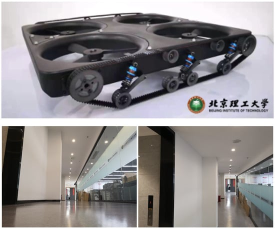 We conducted real-world experiments on a self-developed hybrid ground/aerial vehicle (Figure 10) to prove the effectiveness and robustness of our system on this special vehicle. The quad ducted-fan hybrid ground/aerial vehicle moves on the ground with its continuous tracks and flies with four ducted fans. To sense the environment, it is also equipped with an Intel Realsense D435i camera and an NVIDIA Jetson Xavier NX. The laboratory for the indoor experiments is shown in Figure 11. The robot’s ground-truth position is provided by a NaturalPoint OptiTrack motion capture system, whose effective range in this room is about 5 . During the experiments, the hybrid ground/aerial vehicle was manually controlled. It reached about after take-off and flew three rounds stably. After landing on the ground, it drove nearly one round along a circular path with continuous tracks. Color images from the left camera (15 Hz) and IMU measurements (200 Hz) of D435i were recorded on-board and stored in rosbags.