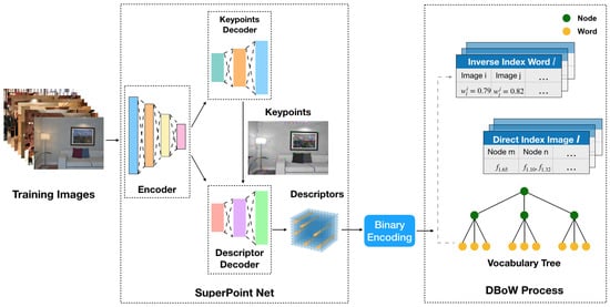 The pipeline of offline training is shown in Figure 2. To obtain a rich set of features, we prepare sufficient training images from different datasets, such as ICL-NIUM [] and TartanAir []. It is worth noting that the training images are independent of those processed online later. With the open-released pre-trained weights of SuperPoint net, the input tensors that are converted from the original images are first encoded. Then the encoded tensors are decoded by the interest point decoder and descriptor decoder separately. The descriptors used for training are extracted according to the keypoints from the interest point decoder. Instead of using the original descriptors with float values, we discretize a binary descriptor space to create a more compact vocabulary. The details of binary encoding are described later. The binary SuperPoint descriptors are utilized in the DBoW process to build the tree-structured vocabulary. In the DBoW process, the descriptors are first clustered into k groups by executing k-medians clustering with k-means++ []. The k clusters constitute the first level of the vocabulary tree nodes, while the subsequent levels are built by repeating the clustering operation on each node. Finally, a tree with nodes and leaves (visual words) is constructed. Moreover, a direct index storing the features of each image and an inverse index storing a list of images for each word are also generated to speed up querying and verifying loop candidates later.