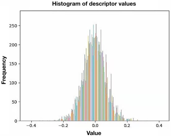 The DBoW approaches in the state-of-the-art visual SLAM frameworks prefer utilizing handcrafted binary features. In the training process, they can construct compact vocabularies. In the process of online loop closure, the keyframe query can also be extremely efficient with binary descriptors, as they can be processed and clustered fast. By contrast, the deep-learned features, such as SuperPoint descriptors, are high-dimensional, concentrated and in float format. We analyzed the value of SuperPoint descriptors extracted from several independent images statistically. A histogram of the collected descriptor values is shown in Figure 3. There is a total of 1675 descriptors with 256 dimensions involved. The colors on the histogram are randomly selected and used to distinguish the dimensions. As can be observed in Figure 3, the values of the descriptors are normally distributed with an expected value of 0 and a standard deviation of . Moreover, this distribution does not change with dimensions, as the colors in the figure are evenly distributed. It is clear that values like this are hard to be discretized into clusters of the tree-structured vocabulary.