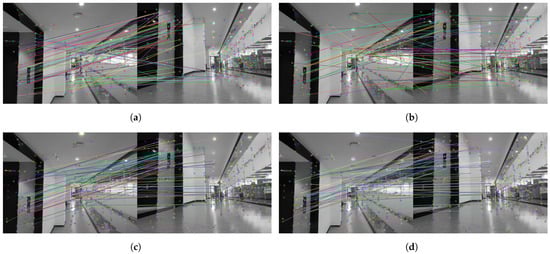 Comparison of image matching results. (a) With BRIEF descriptors. (b) With ORB descriptors. (c) With the original SuperPoint descriptors. (d) With the binary SuperPoint descriptors.