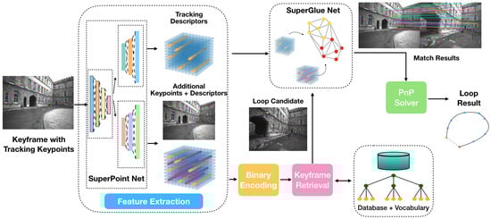 In contrast to handcrafted local features, efficiently using learning-based features in loop closure detection is an open question. Yue et al. [] have used SuperPoints for place recognition based on an incremental BoVW approach with a graph verification process. GCN [] has evaluated a learned keypoint and descriptor detector using a naive SLAM system, including loop closure with a BoVW library. Although the studies mentioned above have integrated learned features into the fast BoVW models, none have tested the algorithms in real-time datasets. Based on GCN, GCNv2 has been designed to suit the real-time ORB-SLAM2 by training networks for binarized feature descriptors and keypoint detectors []. GCNv2 has demonstrated the potential of integrating pre-trained deep learning models into real-time systems. Inspired by the above analysis, our research focuses on providing a more robust and efficient loop closure detection approach with the combination of simplified SuperPoint features and BoVW models.
