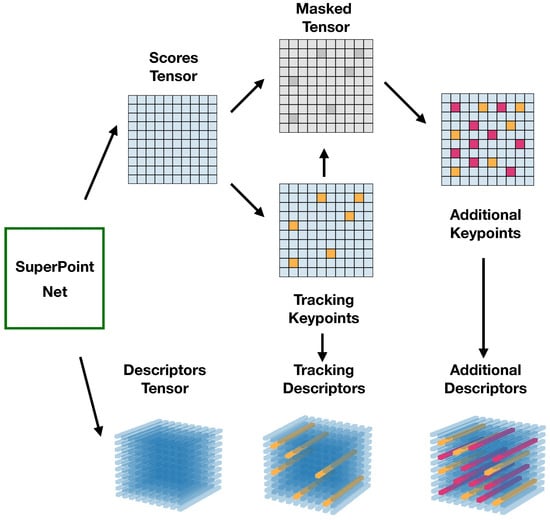 Once the image is processed and forwarded by the pre-trained SuperPoint nets, tracking descriptors and additional features are extracted from the SuperPoint output tensors and . The original feature extraction methods in SuperPoint cannot be directly used in the proposed system. The tensors are processed to extract the two kinds of descriptors, as illustrated in Figure 6.
