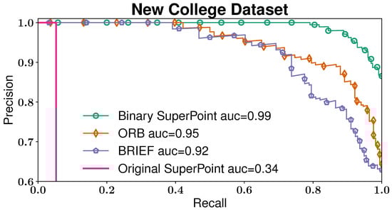 Precision-recall curves of binary SuperPoint, ORB, BRIEF and original SuperPoint descriptors on the New College dataset [].