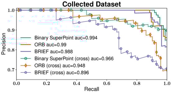 The precision-recall matrices of binary SuperPoint, ORB and BRIEF descriptors are shown in Figure 8. Generally, curves with the term “(cross)” are lower than the curves of the first experiment. It demonstrates the difficulty of loop closure detection under perspective changes. It is also observed that the curve of binary SuperPoint in cross-verification has an area of under the curve, higher than ORB () and BRIEF (). The precision of binary SuperPoint in cross-verification at a recall rate of is about , the highest among all curves. It supports that using binary SuperPoint is more reasonable than handcrafted descriptors for image retrieval problems, especially on our hybrid ground/aerial vehicles.