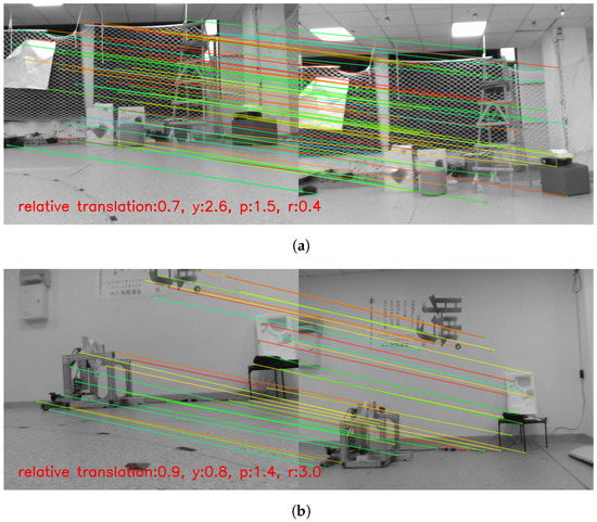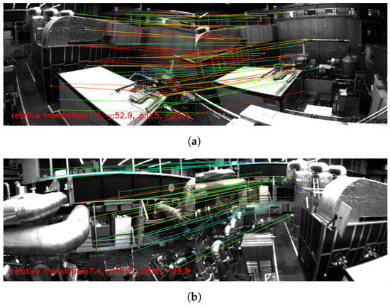 Some loop pairs with large viewpoint changes are shown in Figure 9, where and denote the relative pitch and roll angles. For example, the relative angle between the loop candidate and the current keyframe is over 50 in Figure 9a, and the relative translation is in Figure 9b. In such situations, our system can not only retrieve the correct loop candidate but also match features precisely. It is also worth noting that in Figure 9d, where the illumination condition is limited, the proposed method can also extract distinct descriptors to close the loop. Overall, it is convincing that our loop closure detection approach can perform more robustly against viewpoint changes due to its reliability of recalling and feature matching.