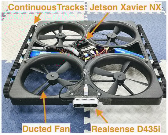 A self-developed hybrid ground/aerial vehicle with continuous tracks, ducted fans, an Intel Realsense D435i camera and an NVIDIA Jetson Xavier NX.