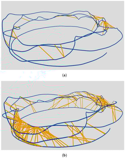 To illustrate the detected loops in the experiments, in Figure 12, we display the trajectories with loop links of VINS-Loop and ours, respectively. Each trajectory has two parts: three flying rounds (the upper zigzag circles) and a driving round (the lower smooth circle). Intuitively, the proposed system has drastically more loop links than VINS-Loop. In Figure 12a, only several loops with similar views are closed, and almost no loops between aerial and ground-level views are detected. On the contrary, plentiful loops with large viewpoint changes can be observed in Figure 12b.