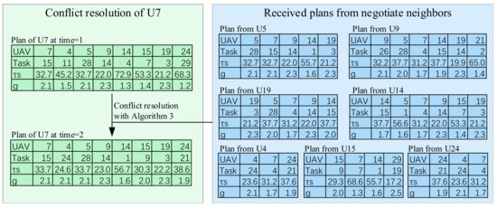 After the reconnaissance UAVs generate a reconnaissance plan and share it with each other, each node uses Algorithm 3 to fuse the received plan with its own plan. The fusion process of U7 is as Figure 4 shows, and at time = 1, U7 tends to give priority to nearby tasks due to its own attention mechanism, so its assignments include U4→T11, U14→T4, and U24→T29. However, this attention mechanism can cause inconsistencies among the generated plans when the distance between two UAVs is large. When merging the received plans with its own, U7 will take out the inconsistent part and redistribute it. At this time, its attention mechanism will be disabled, making the integrated plan more consistent with the views of each participant.