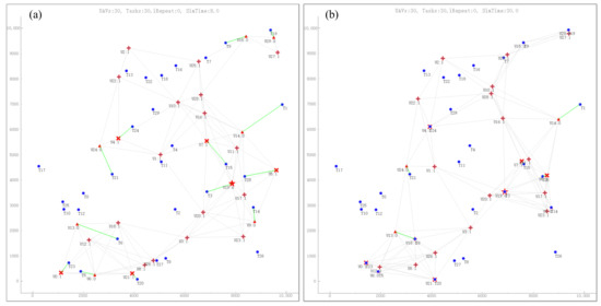 Figure 5. Topology diagram for different simulation times. (a) Each reconnaissance UAV has confirmed the reconnaissance task before time = 8. (b) Each reconnaissance node executes reconnaissance task, and the strike nodes perform deterrence maneuver at time = 30. The meanings of elements are consistent with those in Figure 3.