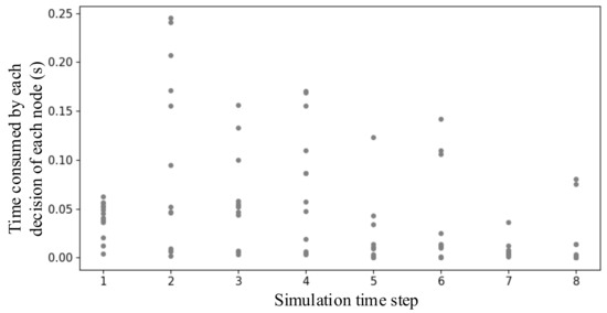 We have counted the decision-making time consumption of each reconnaissance UAV in steps 1–8 during the optimization of reconnaissance task allocation, because all UAVs have confirmed their tasks at the end of the 8th simulation step. The results are shown in Figure 7, and it can be found that the time consumed by each decision of each UAV is less than 0.25 s. Without considering the communication delay, if the maximum decision time of each step is taken as the cycle of this round of iteration, the total time of 8 simulation steps is 1.02 s. From the time-consumption distribution, it can also be found that the first step of decision-making only consumes a little time, while the second step of decision-making takes the most time, and then decreases gradually. This is because before the first decision, there is no communication between nodes, and each node makes decisions independently. The second decision is made after exchanging the results of the first round, and at this time, each node is performing conflict resolution on multiple collected plans, so it takes a lot of time. After the second step, the conflict between plans is gradually resolved, so the decision-making time is also shortened and the final task-allocation plan is formed. The optimization results are shown in Table 6, and from the global perspective, its fitness is 27.48 using Equation (9).