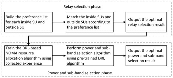 Due to the huge number of combinations of power and sub-bands, we decompose the target problem and optimize the target function for inside users and outside users, respectively. The flowchart of our proposed algorithm is shown in Figure 2. First, the relay selection is performed to select relay for each outside SU and determine the association between outside SUs and inside SUs. Next, based on the association result, DRL-based power and resource selection algorithm is performed for inside users. Finally, the optimal power and resource selection strategy for inside users is obtained.