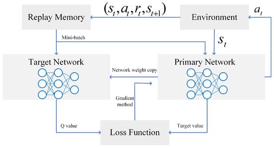 In DQN, the input is the state vector, and the output is the value function vector containing the Q-value of each action under the state. At time t, the agent observes the state s t , chooses the action a t following the strategy, and receives the reward r t . Then, the optimal DQN parameter can be calculated by minimizing the following loss function: