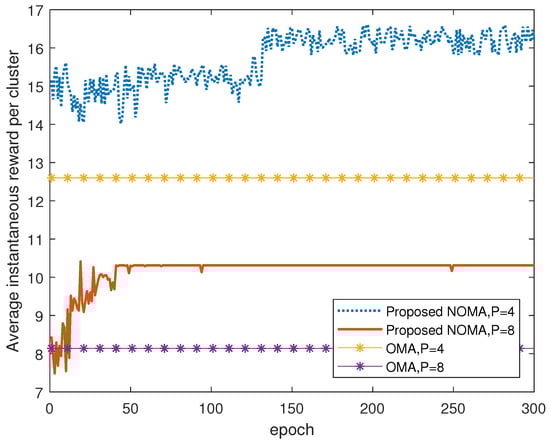 We first verify the convergence of the proposed NOMA algorithm by showing the change of the average real-time reward of clusters during the DQN training process. The number of users is fixed at 32. It can be seen from Figure 4 that the average reward under proposed NOMA outperforms OMA under different numbers of clusters, P. At the beginning of training, the agents tend to select random actions to traverse the environment and evaluate the Q-value of the possible actions. With the continuous increase of experience samples and the improvement of DQN’s approximation of the Q-function, the real-time reward increases rapidly. As the learning progresses, the strategy gradually stabilizes, and the real-time reward converges. After several epochs, the DQN curve tends to converge, which means that the optimal strategy has been learned. Another observation is that in the case of P = 4 , it takes a longer time (around 135 epochs) to converge than the case of P = 8 . When P = 4 , the users in the same cluster is increased to 16, the interaction process between each agent and the environment is more complicated due to the increased number of agents, and therefore the speed of learning the optimal strategy slows down.