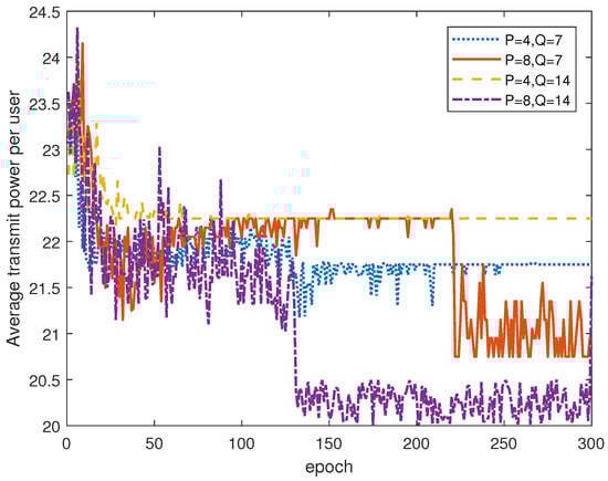 In Figure 5 and Figure 6, we explore the power consumption and QoS satisfaction changes with the number of clusters, P, and the number of power levels, Q. In Figure 5, we plot the average transmit power for our proposed NOMA under different P and Q. When the number of clusters P is fixed, the power consumption decreases as the number of power levels Q increases. The reason for this is the agent is more declined to select a lower power level under the motivation to increase the reward. Under this circumstance, more power levels enable the agent to have more actions to select in the learning process, and the agent tends to reduce its own power consumption while ensuring QoS to increase the reward. When Q is fixed, the power consumption of P = 4 clusters is greater than that of P = 8 . As the number of users in the cluster is reduced, the number of users in each sub-band is reduced, and the interference level among users sharing the same sub-band is reduced. In this case, complex SIC is unnecessary. Therefore, compared with P = 8 , an upper transmission power is needed to meet the QoS requirements of users, thus increasing the energy consumption.