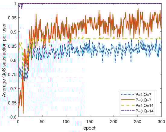 Figure 6 shows how the QoS satisfaction varies with different P and Q. QoS satisfaction is defined as the ratio of the number of users whose QoS requirement is satisfied to the total number of users. In the case of P = 4 , when Q increases from 7 to 14, the agent has more feasible actions to select, thereby increasing the probability of increasing the transmission rate and reward. More power levels are beneficial to SIC, thereby increasing the QoS satisfaction. However, when the number of clusters is increased to eight, there is only a slight difference in the QoS satisfaction under two different power levels. This is because there are only four users in each cluster, sharing two sub-bands. Therefore, the interference between users is trivial and the interfering signals can be readily differentiated by SIC, which guarantees that most users can reach their QoS requirements.