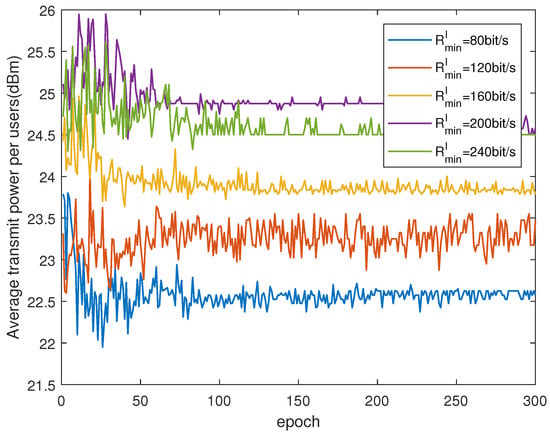 In Figure 9, we fix R m i n C = 180 bit/s and explore the impact of different R m i n I on system performance. We fix the number of clusters P = 8 and the number of power levels Q = 7 , and investigate the power consumption of proposed NOMA. It can be seen from the figure that as the user’s QoS requirement increases, the users’ power consumption gradually increases. When R m i n I is increased from 80 bit/s to 200 bit/s, the power consumption increases. The reason for this is that as the required rate increases, it becomes more difficult to reach R m i n I , especially for inside users acting as relays whose rate requirements become even larger. Hence, the users can only increase the transmit power to increase the transmission rate, which leads to the growth of power consumption. However, as R m i n I increases from 200 bit/s to 240 bit/s, energy consumption decreases. The reason for this is that when R m i n I is too large, the QoS requirements of a large number of users cannot be satisfied. From the perspective of increasing instantaneous reward, the agents tend to lower their transmit power, which leads to the reduced energy consumption.