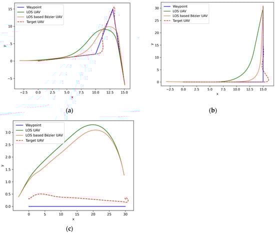 The results of LOS-based Bézier simulation: (a) results of the LOS-based Bézier simulation; (b) results of the LOS-based Bézier method on a random flight path with a 90-degree turning flight path simulation; (c) results of the LOS-based Bézier method on a straight flight path with wind simulation.