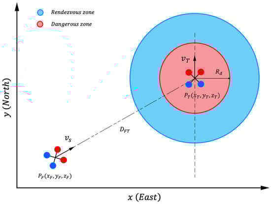 where () is the position of the follower UAV in the NED coordinate system in AirSim and () is the velocity of the follower UAV. Because there are two different states, namely, outside and inside of the rendezvous zone, as shown in Figure 3, the tuning parameters of KFs () are separated into two groups as follows: