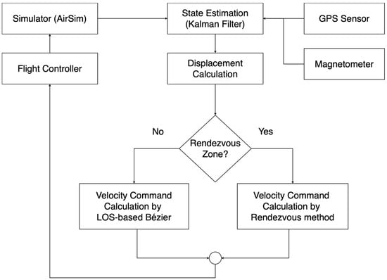 A proposed rendezvous method guides a following UAV moving toward the target UAV based on the heading angle estimation resulting from LOS guidance and position estimation by nonlinear KFs. The processes work based on considering the relative velocity and displacement between the two UAVs. The proposed rendezvous state processes apply to the sky-blue and red areas in Figure 3, which are separated into a rendezvous zone and a dangerous zone. Algorithm 2 and Figure 4 describe the simulation procedure of the proposed rendezvous method, which command a UAV via conventional LOS guidance alone. The position and velocity of the target UAV are obtained and the output is given as the proper velocity vector from the conventional LOS guidance based on the displacement and position of the UAVs at that time to steer the follower UAV. The experiment implements nonlinear KFs with an offline dynamic dataset exported from AirSim and keeps the data from the magnetometer and GPS sensor as the measurement parameters. As mentioned, the proposed rendezvous processes deploy the relation between velocity and displacement to define a setting parameter for the flight controller to command UAV movement.