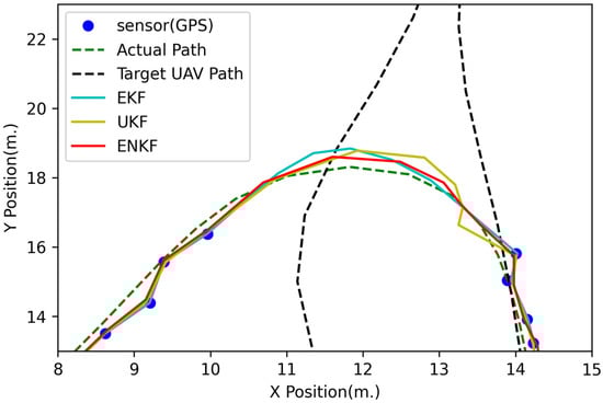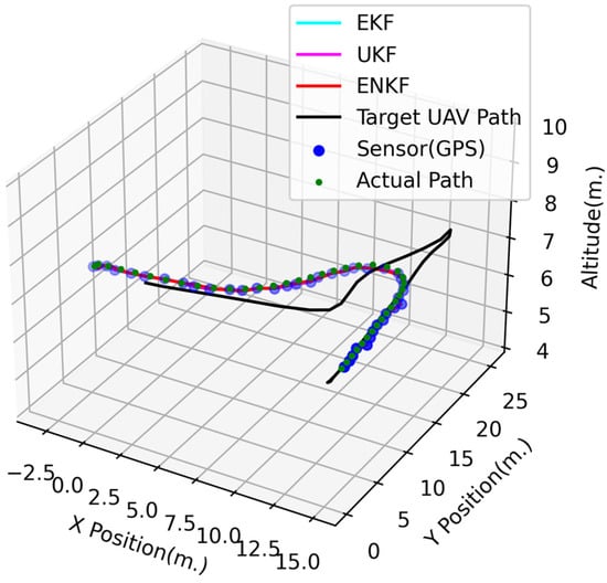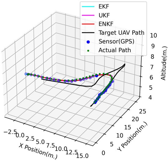Figure 8, Figure 9 and Figure 10 show the 3D and 2D position estimations of the follower UAV. Even if the GPS signal is blocked for a period of time, all nonlinear KFs are able to estimate the state or position with acceptable accuracy. In addition, the highest accuracy in this experiment is achieved with the ENKF by an RMSE of equal to 0.29538 m, followed by the UKF (RMSE of m) and EKF (RMSE of m), as shown in Table 1.