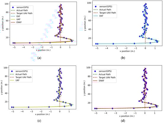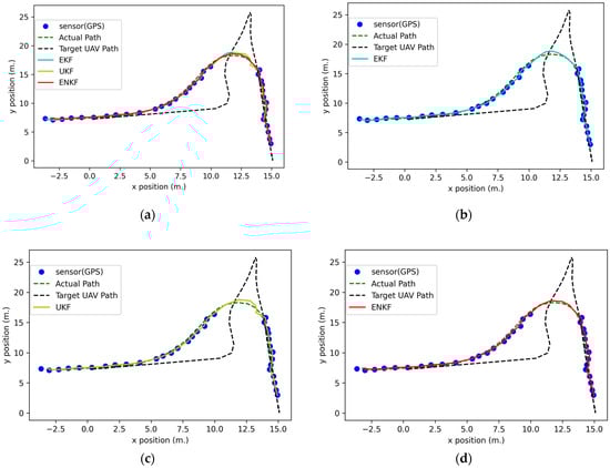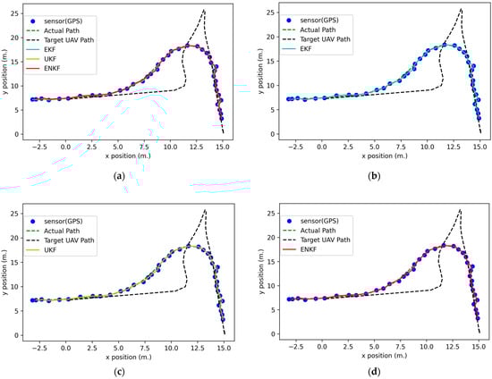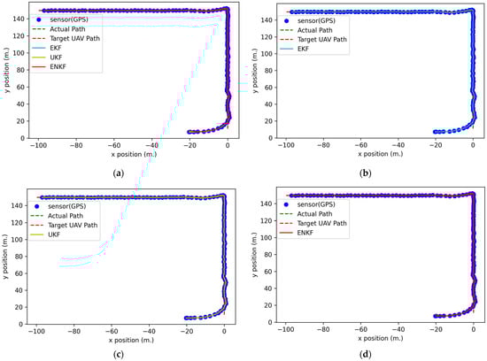 The 2D positions in the full mission state simulation: (a) GPS data comparison with nonlinear KFs; (b) GPS data comparison with an EKF; (c) GPS data comparison with a UKF; (d) GPS data comparison with an ENKF.
