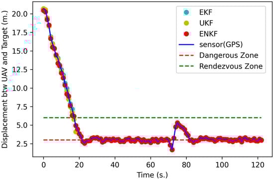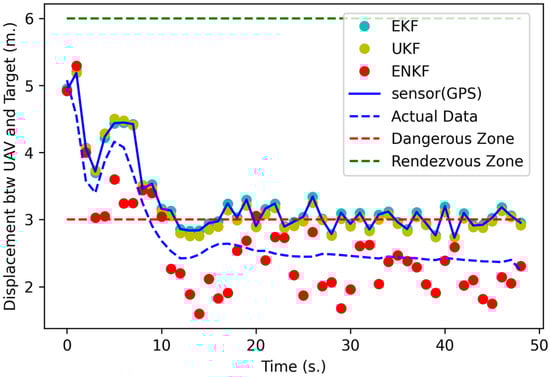 Figure 15 and Figure 16 show the results of the full mission state. Figure 15 shows the result of displacement between the UAVs in each time frame. The follower UAV uses the localization method initially until it enters the rendezvous zone after approximately 19 s. Then, the rendezvous method is used to command the following UAV toward the target UAV. After approximately 70 and 80 s, the target UAV turns 90 degrees following the designated path, as shown in Figure 14. During the turn, the target UAV decreases its speed to almost 1 m per second, as shown in Figure 16. Thus, the follower UAV decreases its speed to almost 0.5 m per second and then accelerates to the same speed as the target UAV. The results indicate that the proposed rendezvous method can guide the follower UAV to the rendezvous zone and aid in the approach of the dangerous zone in 22 s (Table 3) at point (0.47686, 51.74109) and an altitude of 6.83795 m based on GPS sensor data only, at point (0.47795, 51.74018) and an altitude of 6.83779 m based on the EKF, at point (0.49439, 51.72599) and an altitude of 6.83809 m based on the UKF, and at point (0.48511, 51.76452) and an altitude of 6.83052 m based on the ENKF. The accuracy assessment of this experiment is separated into two parts, namely, the RMSE of XYZ outside the rendezvous zone and the RMSE of XYZ inside the rendezvous zone, as presented in Table 3. The ENKF performs better than the others both inside, with an RMSE of XYZ at 0.51319 m, and outside the rendezvous zone (RMSE of XYZ at 0.75051 m). The RMSEs in this experiment are higher than those in other experiments because there is a 90-degree turn in the flight path of the target UAV. However, for a very short time, the displacement between UAVs is less than that of the dangerous zone radius. This experiment illustrates that even if the target UAV turns 90 degrees and decelerates, the proposed rendezvous method can still track the target UAV without a collision occurring. From Table 2 and Table 3, the RMSEs of nonlinear KFs are higher than those for the method based only on GPS sensor data because some parameters can be tuned to achieve higher performance.