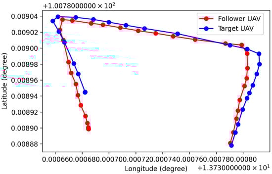 The maximum ground speed () of the follower UAV is set to 3 m per second in the localization state in this experiment. GPS sensors on both UAVs are assumed to operate at 1 Hz. The radius of the rendezvous zone is 6 m to provide enough space, which has been tested to be enough for the follower UAV to slow safely at this speed. The larger the rendezvous zone radius, the safer this algorithm can perform, which depends on many factors, such as the performance of the UAV, the maximum speed, and the environment. Therefore, this work only focuses on how the algorithm performs within the scope of this limitation. If the following UAV is outside of the rendezvous zone radius, the localization processes, which include the LOS-based Bézier method by setting the tuning parameter of the LOS-based Bézier method () to 3 in this experiment, will be applied. After the follower UAV enters the rendezvous zone, the follower UAV is operated according to the proposed rendezvous method described in Section 3.4. The dangerous zone () is set at 3 m around the target UAV in this experiment, and the maximum approach speed () of the follower UAV is set to 2.5 m per second.