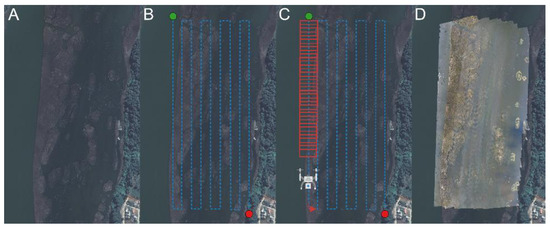Steps for obtaining orthophotographs. (A) Example for the sampling site number 2, (B) the design of the flight transects, (C) the superimposition of the obtained images, and (D) the creation of the orthophotography in the DroneDeploy software.