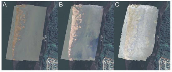 Due to the water brightness, overexposed or badly reconstructed areas can appear in orthophotos; we classified the orthophotos into three classes following Chabot and Francis (2016) [24]: (a) 0, there was no brightness; (b) 1, there was localized brightness; and (c) 2, the brightness was present throughout the orthophoto (Figure 3). We performed an independent analysis for each of the three categories.