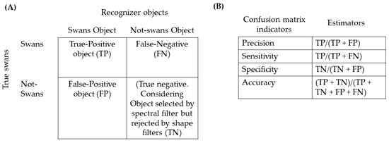 To evaluate the validity of the filtering procedures, we constructed a confusion matrix [52]. We manually checked all objects recognized by the filters in each of the 96 orthophotographs. We estimate the True-Positive objects (TP) as the objects correctly assigned as black-necked swans, the False-Positive objects (FP) corresponding to not black-necked swan objects that the recognizer assigned as swans, and the False-Negatives (FN) as missing black-necked swans archived in the orthophoto but not recognized by the recognizer. In addition, we estimated the true negative as the number of objects recognized by the spectral signature but rejected by the shape filters (TN) (Figure 4a). We estimated confusing matrix indicators, including Precision = TP/(TP + FP), Sensitivity = TP/(TP + FN), Specificity = TN/(TN + FP), and Accuracy = (TP + TN)/(TP + TN + FP + FN) (Figure 4b). Finally, we compared the manual count and recorder estimates in each orthophoto classification fitting linear regression model using R software [42,52].