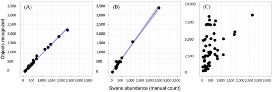Recognizer predictivity capacity. We show the linear regression results between absolute abundance (manual count) and the object automatically recognized. The blue line represents the linear model, and the gray confidence interval uses the standard error. In (A), We present the results of orthophotos without brightness (category 0), (B) moderate brightness (category 1), and (C) high brightness levels (category 2).