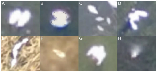 We identified eight situations where the recognizer fails: (i) When two individuals are extremely close, the spectral signature cannot separate individuals (n = 251 individuals). In this case, the shape filter excludes both individuals (Figure 7A). (ii) Two individuals are extremely close and present different sizes (n = 257). The spectral filter recognizes only one individual, and then, the shape filter recognizes it; thus, only one individual is lost (Figure 7B). (iii) Young swans (n = 417 individuals). We optimized the filter to recognize adult shapes and sizes; thus, young swans are discarded (Figure 7C). (iv) Familiar groups (n = 68 individuals). When all swans are close together, the shape filter discards all the individuals (Figure 7D). (v) Adult clusters (n = 44 individuals). In some cases, swans swim in lines very close to each other (from three to eight individuals), and the shape filter discards the object, losing all the individuals (Figure 7E). (vi) Swans in wetland vegetation (n = 85 individuals). We observed that grassland distorts swans’ shapes, and the shape filter rejects these objects (Figure 7F). (vii) Flying swans (n = 8 individuals); extended wings change the object’s shape, and the shape filter rejects it (Figure 7G). (viii) Orthomosaic reconstruction (n = 360 individuals). In some cases, especially on borders, orthophotos present deformations, seams, or gaps affecting swan shapes; therefore, the shape filter rejects the objects (Figure 7H).