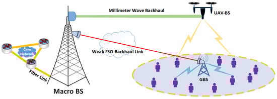 The schematic of the proposed system for high-speed wireless backhauling of a GBS is shown in Figure 1. We assume that a preinstalled FSO link exists between the GBS and the MBS. In the context of B5G, the GBS could be in the same coverage area as MBS, e.g., heterogeneous network or in a remote location, e.g., relay station. FSO-based wireless backhauling solutions are very reliable and offer high achievable data rates in more frequent normal weather conditions. So, in addition to the existing FSO link, installing a parallel high-speed RF link between GBS and MBS just for occasional use in adverse weather events is redundant, expensive (e.g., RF licensing costs), and difficult to maintain considering the large number of anticipated BSs in B5G. When the FSO backhaul capacity drops below a minimal threshold because of the adverse weather conditions, e.g., fog events, the GBS would like to maximize the utilization of its licensed sub-6 GHz spectrum W in the downlink. It takes advantage of the UAV’s services to help some users by letting the UAV use some portion of W, which should be efficiently shared between the two BSs. In addition, the UAV can establish a temporary LoS link for backhaul with any nearby node, including the MBS. Owing to its higher capacity and active beam steering, millimeter wave backhauling outperforms sub-6 GHz backhauling across the RF spectrum [26]. Hence, it is assumed that the UAV establishes a backhaul link to the MBS using an ideal high-speed directional millimeter wave link.