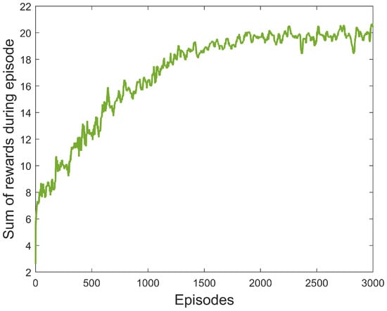 Without loss of generality, the reward function is formulated by the total network throughput for the given weather attenuation. If the action that the UAV carries out at current time t can improve , then the UAV receives a positive reward. The UAV agent receives a negative reward otherwise. Hence, the reward function can be stated as [50]