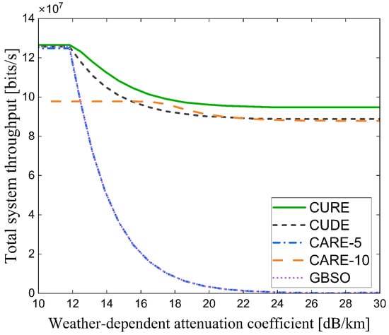 Total system throughput of all the models versus the weather-dependent attenuation coefficient of the FSO link.