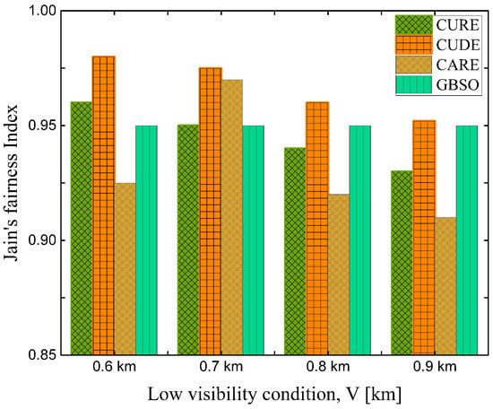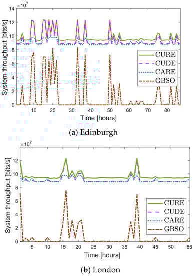We use fog events to simulate the total system throughput using the hourly visibility data, with low visibility hours of 87 and 56 for Edinburgh and London, respectively. Figure 12 demonstrates that the proposed CURE scheme outperforms the other systems, including the GBSO, CUDE, and CARE scheme during the fog events in both cities. When visibility is near 1 km, the CUDE and CARE schemes rarely perform comparably to the proposed CURE scheme. On the other hand, the CURE scheme performs well throughout the fog events in both London and Edinburgh, even when the counterpart models perform poorly. For example, during fog hour 26 and 30 in Edinburgh and London, respectively, the GBSO’s throughput is almost zero, while the CURE scheme still offers better throughput compared to the CUDE and CARE scheme in both Edinburgh and London.