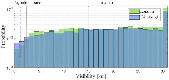 We now evaluate how our system would perform in a realistic channel model that uses climate data from the cities of Edinburgh and London. Figure 11 plots the histogram of hourly visibility for Edinburgh and London as reported by the United Kingdom Meteorological Office for January 2019 to June 2020, totaling = 13,106 h (Edinburgh), = 13,128 h (London). As can be seen, the probability of fog events (visibility < 1 km) which can severely deteriorate the FSO link’s performance is very small. Because FSO links function well most of the time, fixed hybrid FSO/RF links with permanent or backup RF links are not necessarily the most cost-effective and practical solution all the time [6]. To this end, it encourages researchers to come up with short-term solutions such as the one proposed here. These approaches might play a significant role in B5G networks where UAVs can offload traffic from the BS during rare low-visibility situations.