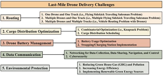 Trucks are the primary transportation method for last-mile delivery. Fossil-fuel trucks cause noise and air pollution, traffic jams, cluttered parking spots, traffic accidents, higher delivery costs, and other unforeseen ground vehicle issues. Delivery trucks [] are about 4% of vehicles on the USA roads; they cause about 50% of the nitrogen oxide emissions, 60% of the fine particulates, and 7% of all greenhouse gas emissions in the USA. Hence, many retail companies, such as Amazon, Alphabet Wing, Walmart, UPS, etc., lean toward using the drone technology as a sustainable transportation method as it offers eco-friendly, faster delivery with lower operating costs and less human involvements [,,,,,]. Other companies, such as Mercedes-Benz, started collaborating with the drone manufacturer Matternet to implement the on-demand delivery of e-commerce products using electric vans and drones []. Besides delivering standard parcels, drones are also used in food delivery [,,,,,,,], vaccine delivery [,,,,], and the delivery of other lifesaving supplies in disaster relief operations []. However, utilizing drones in last-mile delivery has numerous challenges, such as reducing delivery costs, increasing energy efficiency, lowering environmental harms, tracking parcel deliveries, preventing sporadic delays in deliveries, staying on track with advanced technologies, etc.