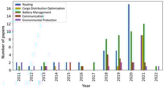 Figure 2 shows trends in the selected publications from 2011 to 2022 with respect to the technical challenges of last-mile drone delivery. There is a growing trend of publications that address drone battery management since 2018. In addition, the routing problem remains a hot topic among publications from 2011 to 2022. Cargo distribution optimization, data communication, and environmental protection have been drawing attention from time to time. Section 3, Section 4, Section 5, Section 6 and Section 7 present the literature review analysis of the selected publications by highlighting advancements and future opportunities with respect to each key technical challenge.