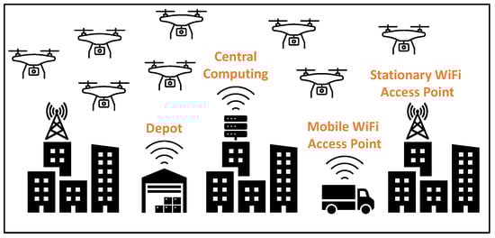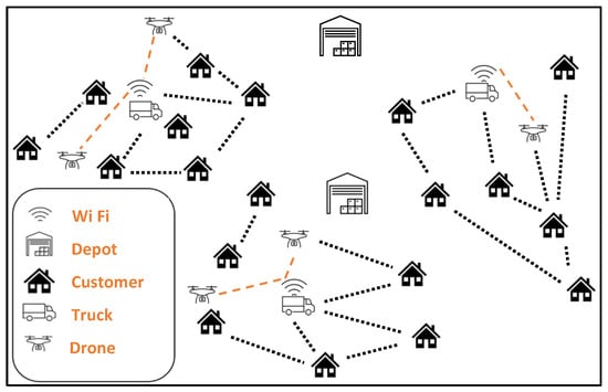 As last-mile delivery in urban areas directly influences customers, retail companies regard it as a powerful tool for attracting more consumers. Drones with intelligent routing capabilities would benefit last-mile delivery by offering eco-friendly, lean, reliable, fast, and sustainable delivery services. In particular, the implementation of flying sidekick drones and trucks in last-mile delivery, as illustrated in Figure 3, would help reduce the overall operation cost, fuel consumption, and environmental harms.