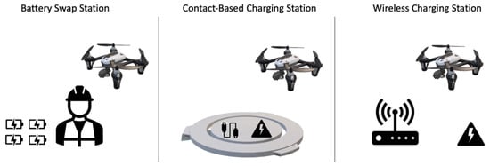 On the other hand, researchers are still trying to optimize the logistics of the drone battery recharging/replacement process. Figure 4 illustrates three types of recharging/replacing stations used for drones: a battery swapping station, a contact-based recharging station, and a wireless recharging station. The battery swap station requires a human operator to replace the depleted batteries of drones with new ones and recharge the depleted batteries. A drone would spend minimal time at the battery swap station as it does not need to wait for recharging. However, the wait time depends on the number of drones in line, the availability of charged batteries, and the human operator’s skill. The contact-based charging station has a recharging pad compatible with different types of drones. The waiting time depends on the number of drones in the recharging line, the number of recharging pads, and the drone recharging time. The wireless charging station provides an electromagnetic field for wireless recharging. A drone should hover in the electromagnetic field of a wireless recharging station to get recharged. This recharging method is fast and efficient as the recharging process can be done autonomously.